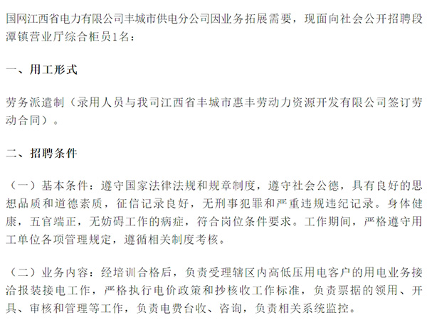 國網江西省電力有限公司豐城市供電分公司因業務拓展需要,現面向社會公開招聘段潭鎮營業廳綜合柜員1名:一、用工形式勞務派遣制(錄用人員與我司江西省豐城市惠豐勞動力資源開發(fā)有限公司簽訂勞動合同)。二、招聘條件(一)基本條件:遵守國家法律法規(guī)和規(guī)章制度,遵守社會公德,...